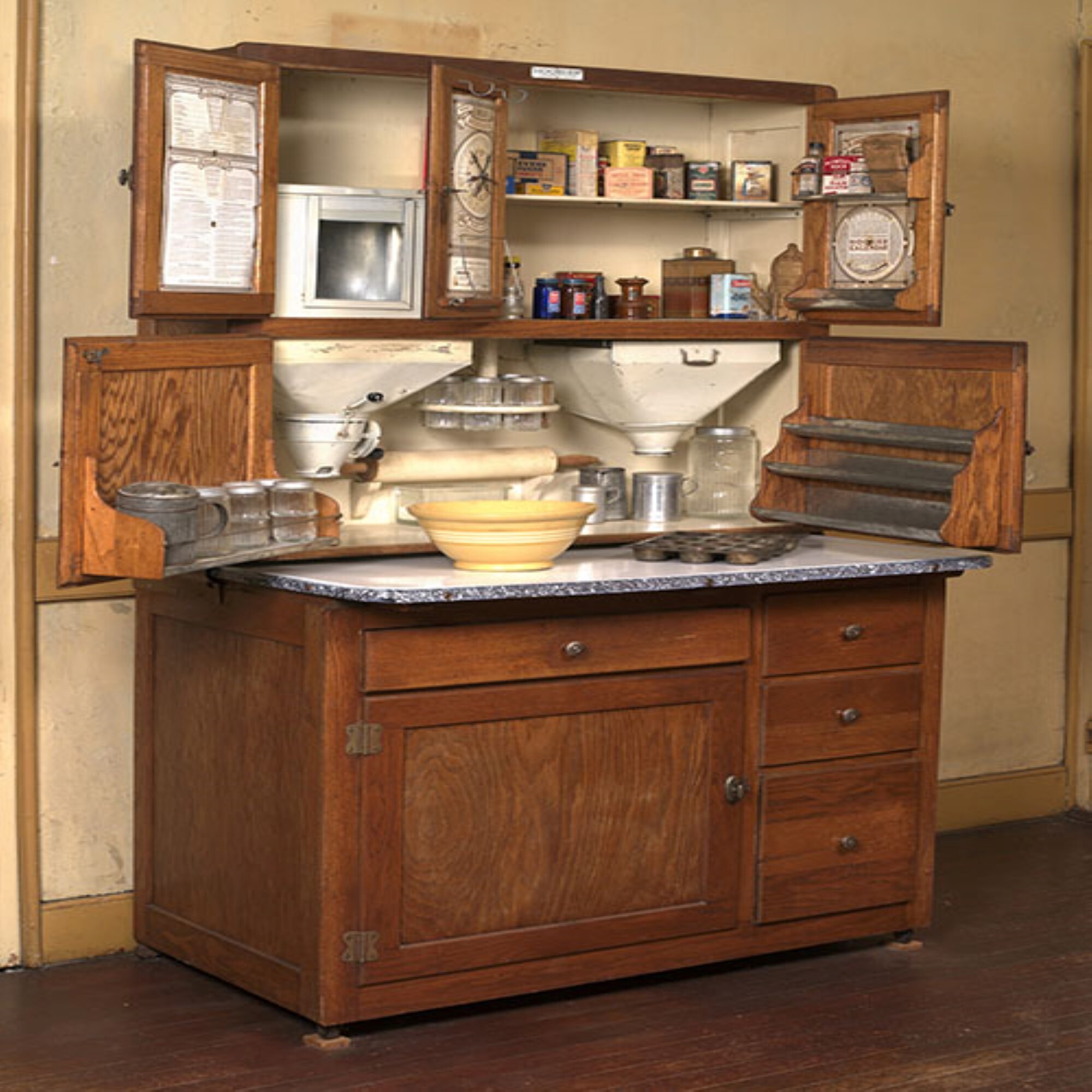 Hoosier Cabinet Dimensions An antique hoosier cabinet is a freestanding cabinet with a rolling pin & cookbook holder, a flour sifter, and many more exciting features as follows: The cabinet joinery is simple, using dadoes, dowels and rabbets.the doors and cabinet sides are made with routed stiles and rails. a hoosier cabinet is a type of kitchen cabinet that stands freely and can also serve as a working kitchen. Measure your cabinet to make sure it fits. an overview of the iconic hoosier cabinet, including its background and history, features, how to identify and pricing estimates. An antique hoosier cabinet is a freestanding cabinet with a rolling pin & cookbook holder, a flour sifter, and many more exciting features as follows: Labeled sections for kitchen utensils and dry goods; although it’s a big project with many pieces, this hoosier cabinet is not hard to build. key identification of antique hoosier cabinets. most antique hoosier cabinets were 6 feet tall, 4 feet wide, and about 2 feet deep. the hoosier cabinet performed all the roles that beecher recommended, packing an impressive array of functions into a typical footprint just 24 deep and 48 wide.